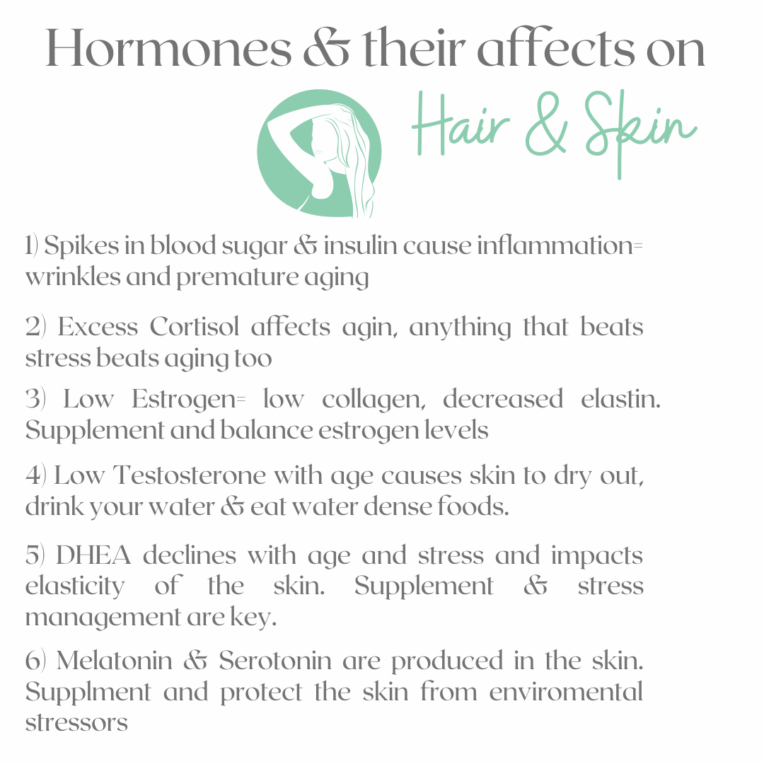 If your skin does not produce enough sebum (oil) dryness and wrinkling occur. The opposite where too much oil is produced we can have breakouts and hormonal acne. And surprise! your sebum and sweat glands respond too??…… yup your hormones. Testosterone, DHEA, & Progesterone excess is linked to breakouts and acne. Testosterone, Estrogen, & DHEA imbalance can contribute to excess sweating and body odor. Thinning, loss of elasticity and sagging comes with decreased estrogen as we age, which is why during and post-menopause we see such a change in our aging skin.